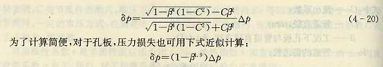 壓力損失是指由于節(jié)流件的節(jié)流作用造成的不可恢復(fù)壓損δp。它是在其他壓力影響可以忽略不計(jì)時(shí),在節(jié)流件上游側(cè)(大約上游1D處)測(cè)得的靜壓與靜壓恰好完全恢復(fù)的節(jié)流件下游(大約在下游6D處)所測(cè)的靜壓之差。標(biāo)準(zhǔn)孔板的壓力損失可用式4-20近似地計(jì)算: