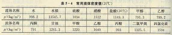 當(dāng)ρ>ρ0,即實(shí)際使用的流體密度大于標(biāo)定介質(zhì)的密度時(shí),qv<qv0,也就是說,實(shí)際流量小于流量計(jì)的讀數(shù);反之,如果ρ<ρ0,則qv>qv0,即實(shí)際流量大于流量計(jì)的讀數(shù)。表5-4給出了幾種常用液體的密度值,供液體流量刻度換算時(shí)查用。
