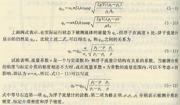 設(shè)ρ0、qv0、α0分別表示浮子流量計(jì)在刻度狀態(tài)下標(biāo)定介質(zhì)的密度、體積流量及流量系數(shù);而用ρ、qv、和α分別表示實(shí)際運(yùn)行狀態(tài)下被測(cè)介質(zhì)的密度、體積流量和流量系數(shù),則根據(jù)流量公式(5-8)可得