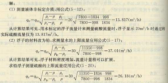 例一:一浮子流量計(jì),浮子材料為鋼,密度為ρ=7800kg/m3,用20℃的水標(biāo)定(水的密度為ρ=998kg/m3,流量計(jì)測(cè)量上限為30m3/h.現(xiàn)用戶用來(lái)測(cè)量流速(硫酸密度為ρ=1834kg/m3),求: