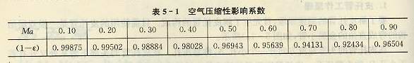 從上式可以看出,Ma越大,壓縮性的影響也越大。表5-1是空氣(設k=1.4)的壓縮性影響系數(shù)與馬赫數(shù)Ma的關系。